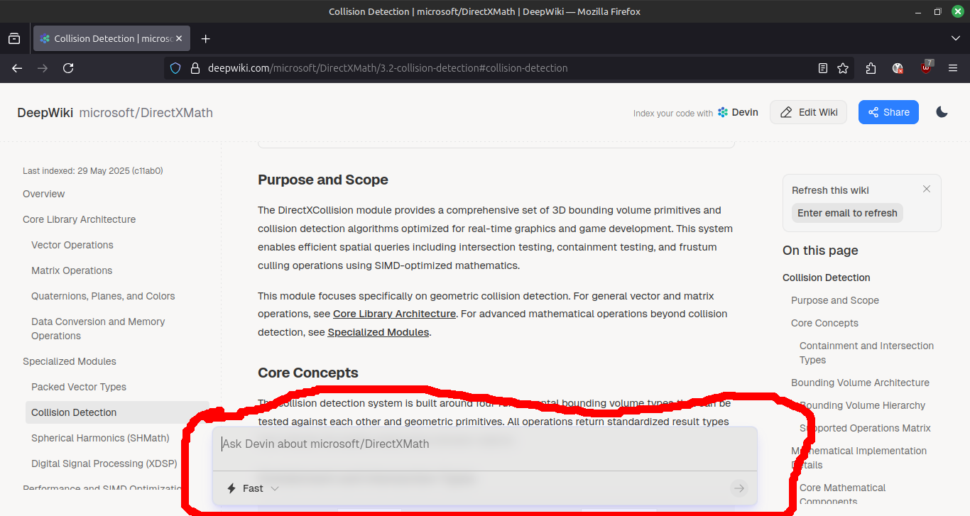 Image description: A screenshot of the DirectXMath documentation, with an AI ask box on the bottom covering up a vertical area of about 5 lines of text in the main section of the website, without any way to close or hide it.