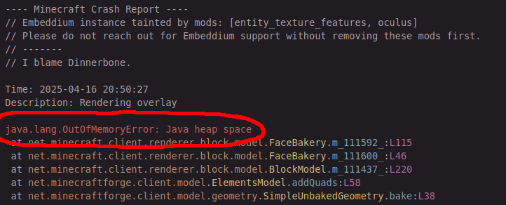 java.lang.OutOfMemoryError: Java heap spaceThat means you need to allocate more ram (-Xmx) to your modpack, or you have to reduce the load by using less shaders, resource packs, mods, etc.
